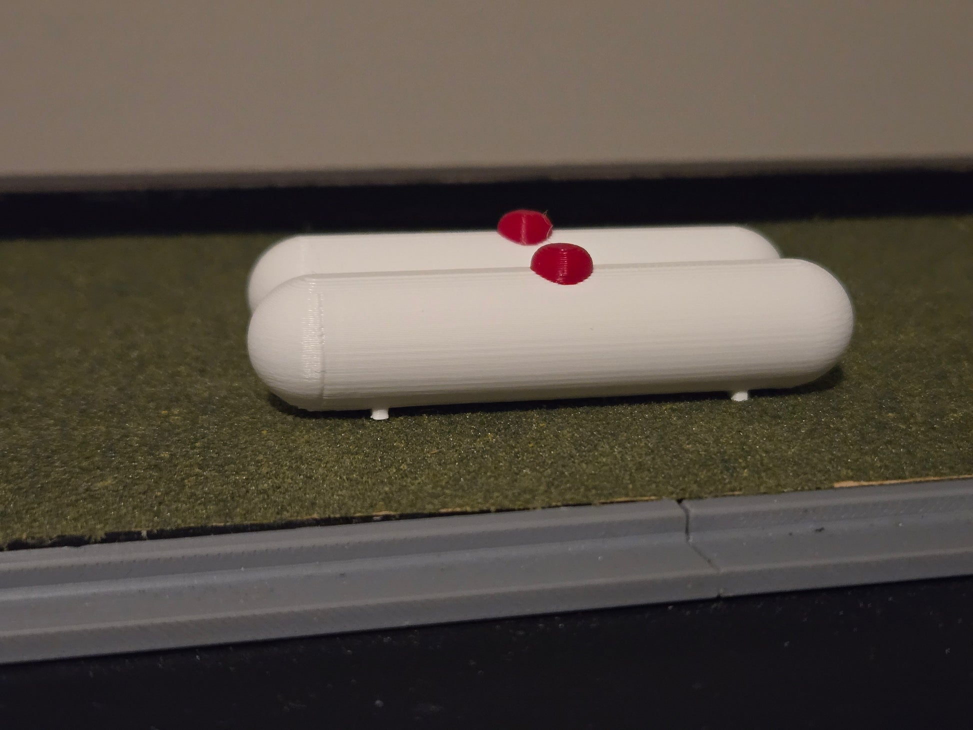 This is a set of two 1,000 Gallon propane storage tanks in 1/64 scale. The tank is white with a red top. This will make a great addition to your collection to add detail and realism to your diorama or layout!