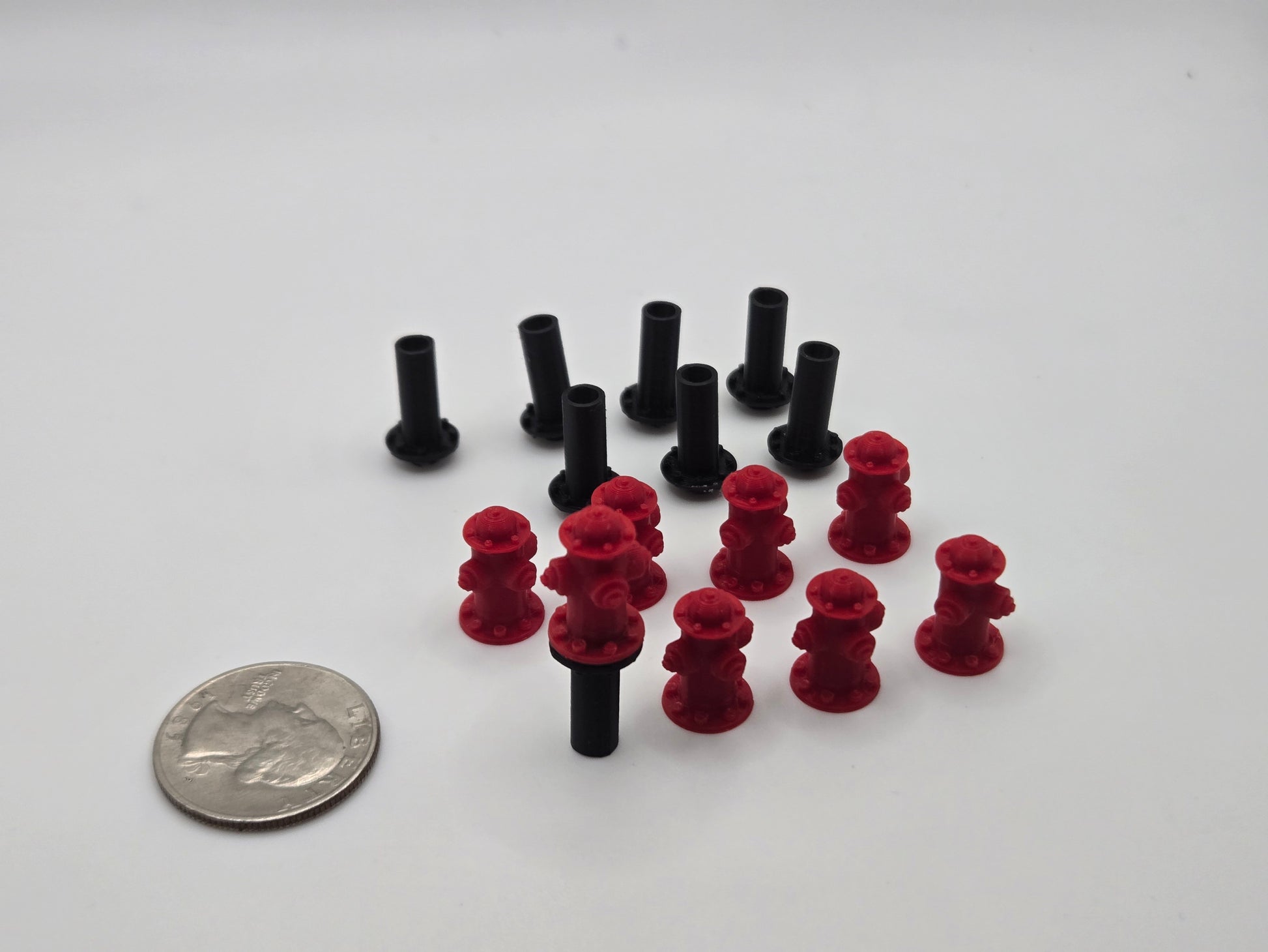 Each piece is 3d printed and then inspected by hand. The down pipe and the hydrant are two separate pieces that can be glued together if desired.