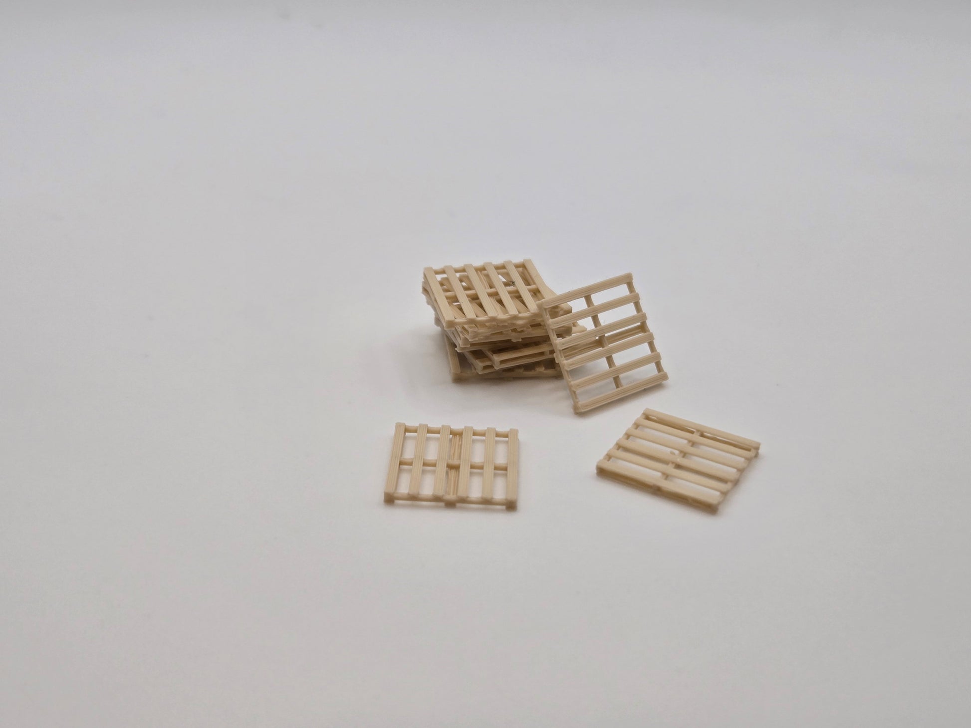 Set of 10 3D printed wood pallets in 1/87 scale. These can add detail and realism to your diorama or layout and make a great addition to any collection!