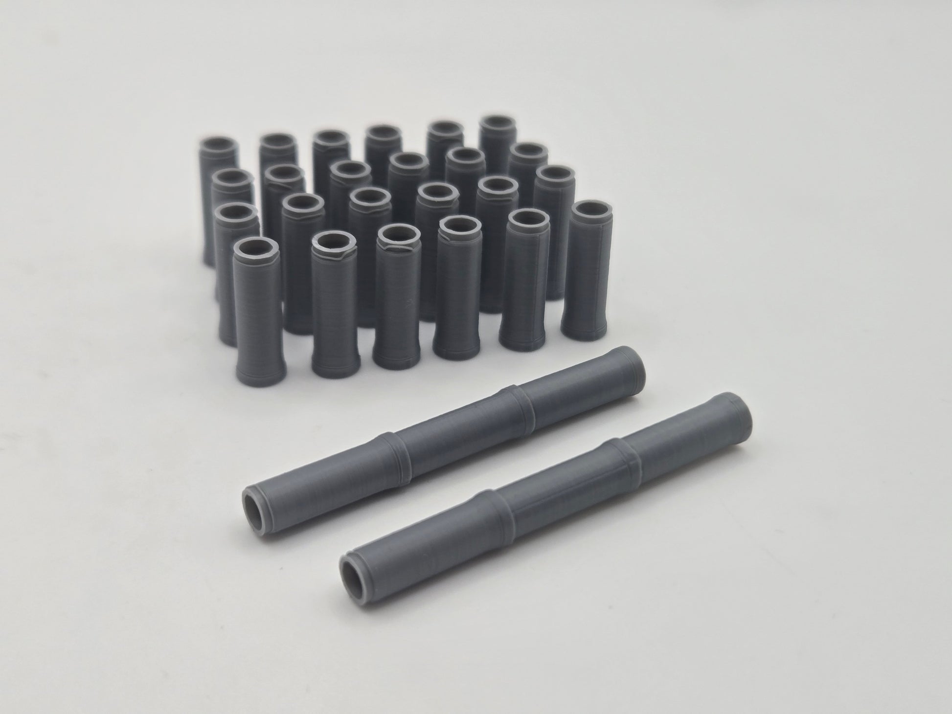 This is a set of 30 pieces of 8 foot long 24 inch diameter reinforced concrete pipe in 1/160 scale. The sections of pipe fit together and can be displayed in a ditch, on a flatbed, being carried on forks, or in many other ways. These can add great detail and realism to your diorama or layout!